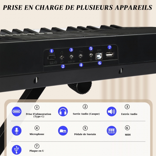 【Fonctions Pratiques】Ce clavier 61 touches dispose d'une double alimentation (adaptateur secteur inclus + 4 piles aa non incluses). La prise casque vous permet de profiter d'une musique immersive sans déranger les autres. Les 3 modes d'apprentissage (modes one-key, follow et ensemble) facilitent l'apprentissage des débutants