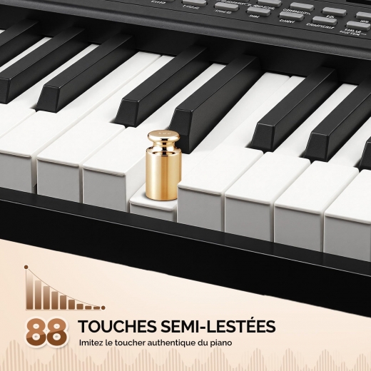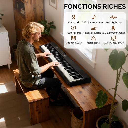【Piano électrique Multifonction】: Conçu avec 88 touches, 1000 timbres, 1000 rythmes et 200 chansons démo. Il propose des fonctions telles que le réglage du volume, la sélection polyphonique, le metronome, l'enseignement, l'enregistrement et le playback, la fonction split/touch control, etc. Ses fonctionnalités riches vous plongent dans l'univers de la musique.